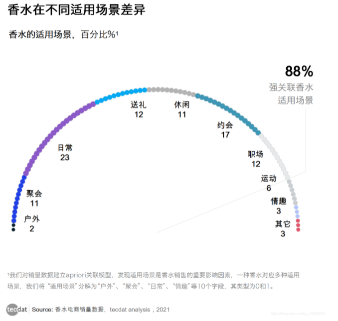 通過(guò)apriori關(guān)聯(lián)模型發(fā)現(xiàn),大多數(shù)香水適用場(chǎng)景之間的關(guān)聯(lián)性非常強(qiáng),表明大多數(shù)香水產(chǎn)品不僅有一個(gè)適用場(chǎng)景,而是有多個(gè)適用場(chǎng)景。大多數(shù)適用場(chǎng)合之間的關(guān)聯(lián)性非常強(qiáng),日常、約會(huì)、職場(chǎng)、聚會(huì)派對(duì)出現(xiàn)的次數(shù)最多,而且是相互關(guān)聯(lián)性最強(qiáng)的場(chǎng)所,情趣、運(yùn)動(dòng)、其他與其他場(chǎng)所關(guān)聯(lián)性不大,說(shuō)明這三類場(chǎng)所針對(duì)性較強(qiáng)。