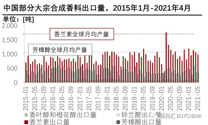 中國(guó)的大宗合成香料產(chǎn)量在國(guó)際上占比高、出口數(shù)量多。每年中國(guó)香精香料產(chǎn)品約1/3用于出口,其中香料產(chǎn)品約2/3用于出口。
