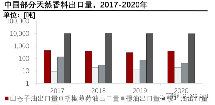 中國(guó)的大宗合成香料和天然香料具備出口優(yōu)勢(shì)。大宗合成香料品類中,中國(guó)的香蘭素、芳樟醇、麥芽酚出口量均占全球產(chǎn)量的50%左右。天然香料產(chǎn)量方面,中國(guó)的天然香料種植資源豐富,且具備許多中國(guó)特有香料品種,如中國(guó)特有的香料山蒼子油,富含檸檬醛,是制取紫羅蘭酮及生產(chǎn)維生素A、E的主要原料。