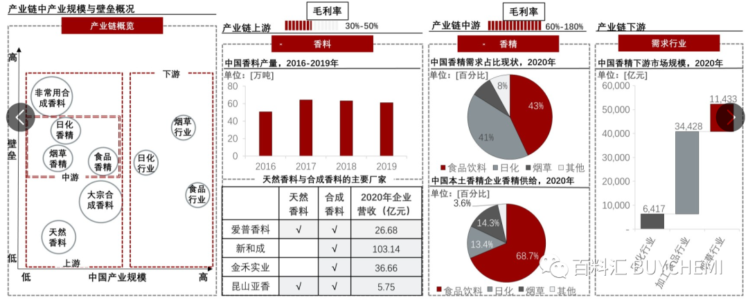 中國(guó)香精香料行業(yè)上游產(chǎn)業(yè)鏈為香料種植與生產(chǎn),中游為香料生產(chǎn),下游為日化、食品和煙草應(yīng)用行業(yè)。其中香料與香精產(chǎn)量處同等水平。