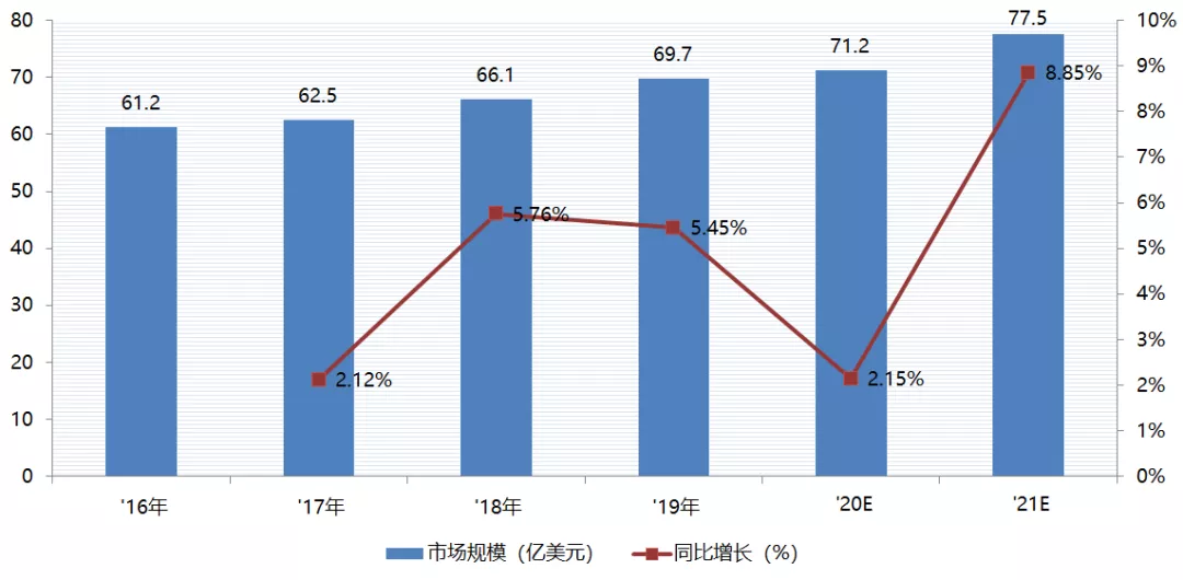 數(shù)據(jù)顯示,截至2019年中國(guó)香料香精行業(yè)市場(chǎng)規(guī)模為69.7億美元,同比增長(zhǎng)5.45%,預(yù)計(jì)在政策以及下游需求不斷驅(qū)動(dòng)下,到2021年中國(guó)香料香精行業(yè)市場(chǎng)規(guī)?;蚩蛇_(dá)77.5億美元。