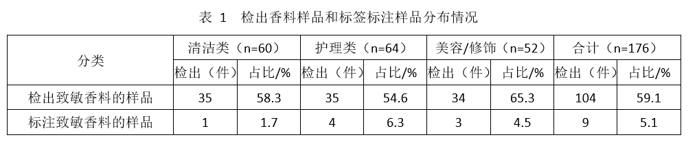 由表1可知,在176批次化妝品樣品中共有104批次樣品檢出一種或多種香料成分,占總樣品批數(shù)的59.1%。不同類型化妝品中香料成分的檢出率無明顯區(qū)別,美容/修飾類化妝品檢出致敏香料樣品占比為65.3%,略高于清潔類的58.3%和護(hù)理類的54.6%,主要因?yàn)?2件美容/修飾類化妝品中,有21件香水,每件香水都檢出含有多種香料,香水中致敏香料較高的檢出率提升了美容/修飾類化妝品整體致敏香料檢出率。176批次調(diào)查樣品總體標(biāo)簽標(biāo)注率為4.5%,其中60件清潔類化妝品僅1件樣品標(biāo)簽標(biāo)注致敏香料。致敏香料的總體檢出率遠(yuǎn)高于致敏香料標(biāo)簽標(biāo)示率,104件檢出致敏香料樣品僅有8件標(biāo)簽標(biāo)注了致敏香料中的一種或多種,其余96件檢出樣品僅標(biāo)注“香精”字樣或無任何標(biāo)示。