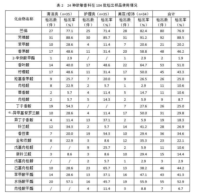 根據(jù)104批樣品檢測(cè)結(jié)果分析24種致敏香料成分在三大類化妝品中使用情況,見表2。