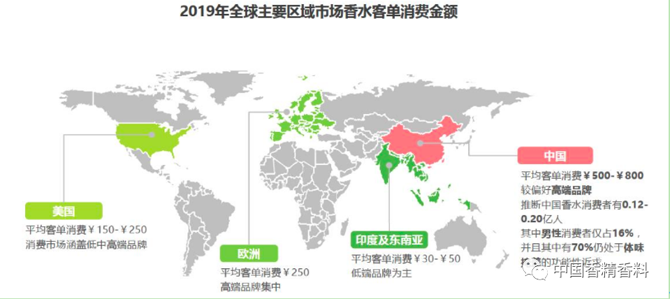 雖然我國香水消費者僅不到0.2億人,但購買能力十分可觀,客單消費金額在500-800元之間,遙遙領先于美國、歐洲、印度及東南亞地區(qū)。
