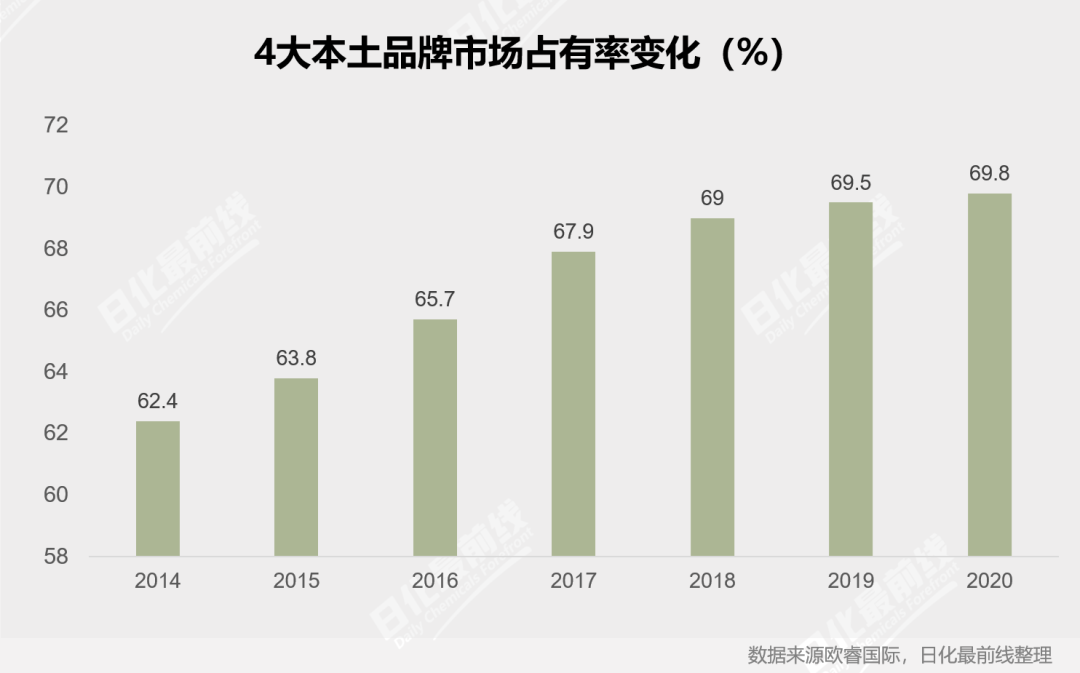 頭部的4個大本土品牌立白、雕牌、白貓以及欖菊的市場份額還有逐年上升的趨勢,在2020年4大本土品牌的市場份額將近70%;