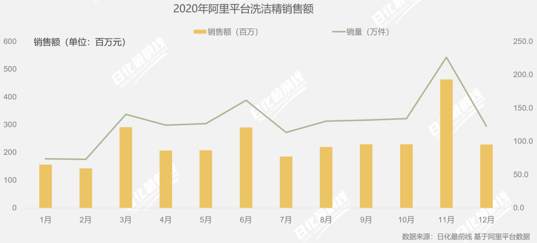 2020年阿里平臺洗潔精產(chǎn)品線上銷售額為11.9億元,同比增加24.6%。銷量約3700萬+件,同比增加32.9%。