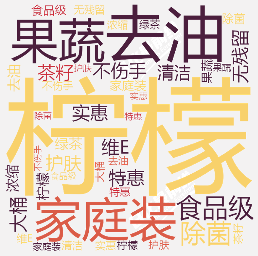 熱銷洗潔精產(chǎn)品大多強調(diào)其去油潔凈不傷手食品級的功效,另外檸檬香味是最主要的香味,與此同時家庭大桶裝、實惠特惠也是線上熱銷產(chǎn)品的主要賣點。