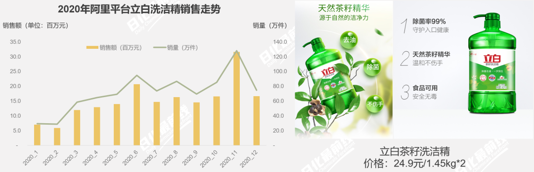 立白洗潔精在阿里平臺上的銷售額1.83億元,銷量864萬件,銷售額同比增速39%;