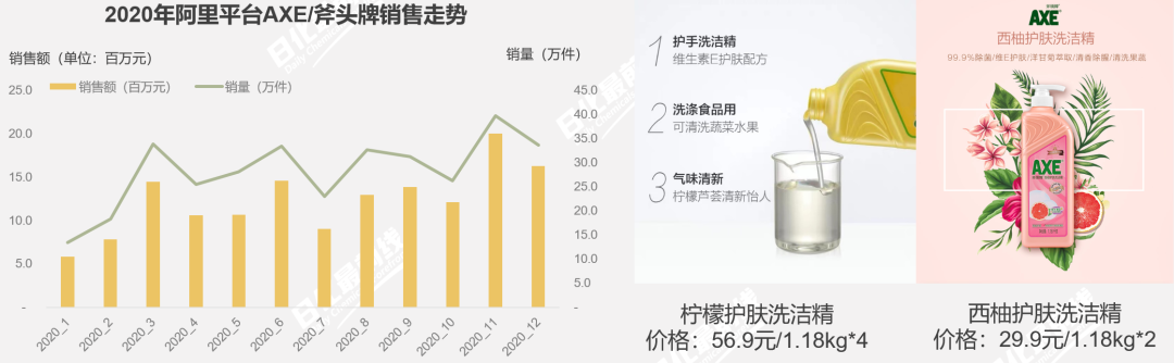 AXE/斧頭牌洗潔精在阿里平臺上的銷售額1.48億元,銷量將近340萬件,銷售額同比增速38%;