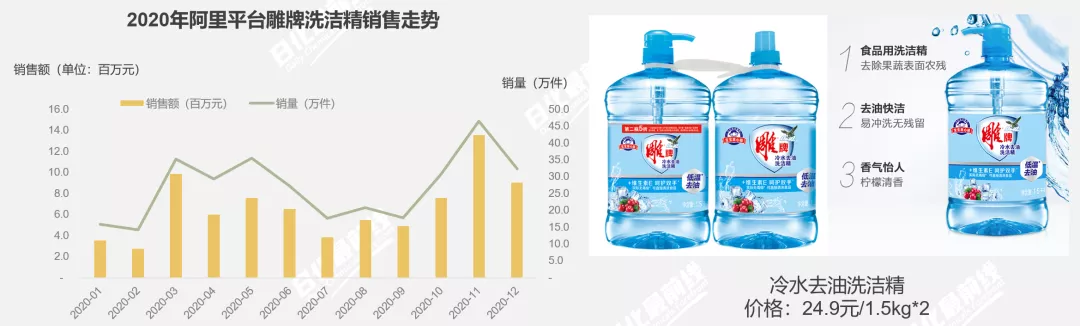 雕牌洗潔精在阿里平臺上的銷售額將近8100萬元,銷量將近323萬+件,銷售額同比增速29%;