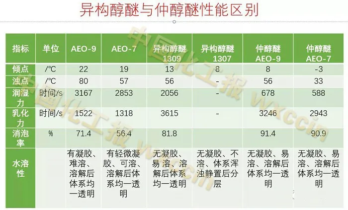 C12~14仲醇聚氧乙烯醚AEO-9、AEO-7與目前液體洗滌劑配方中最主要表面活性劑直鏈醇醚、濃縮液體洗滌劑配方中最常用表面活性劑異構(gòu)醇醚1309、1307進行理化性能比較。