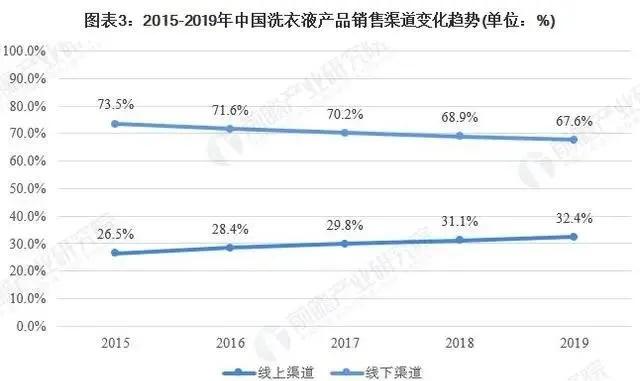 近年來(lái),受益于中國(guó)電子商務(wù)平臺(tái)的發(fā)展,線上零售渠道已成為中國(guó)洗衣液行業(yè)增長(zhǎng)最快的銷(xiāo)售渠道,線上零售規(guī)模將由2015年的44億元增至2019年的88億元,業(yè)務(wù)規(guī)模翻倍。線上零售渠道占比由26.5%增長(zhǎng)至32.4%,預(yù)計(jì)未來(lái),線上渠道市場(chǎng)份額將進(jìn)一步提升。