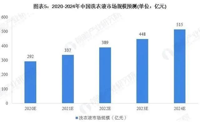 據(jù)弗若斯特沙利文推測(cè),2020-2024年,我國(guó)洗衣液行業(yè)仍將保持13.6%的年均復(fù)合增速高速增長(zhǎng),到2024年,全國(guó)洗衣液行業(yè)市場(chǎng)規(guī)模將超過(guò)500億元。