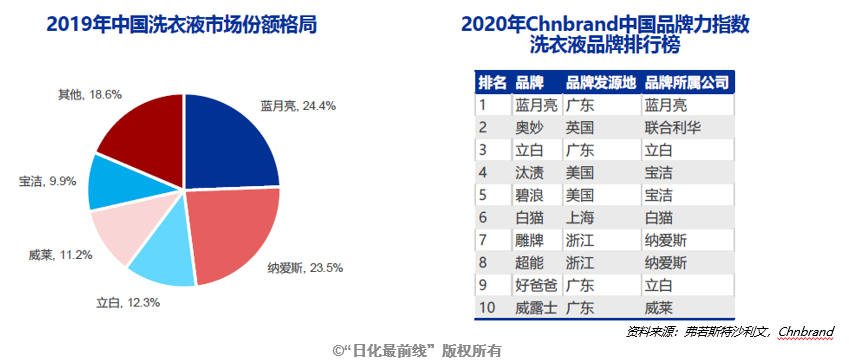 2019年洗衣液TOP5品牌占比達(dá)81.4%,藍(lán)月亮以24.4%的占比排名第一,納愛斯(旗下品牌雕牌、超能等)和立白緊隨其后。Chnbrand中國品牌力指數(shù)洗衣液品牌排行榜顯示,2020年藍(lán)月亮穩(wěn)居榜首;其次為奧妙和立白。