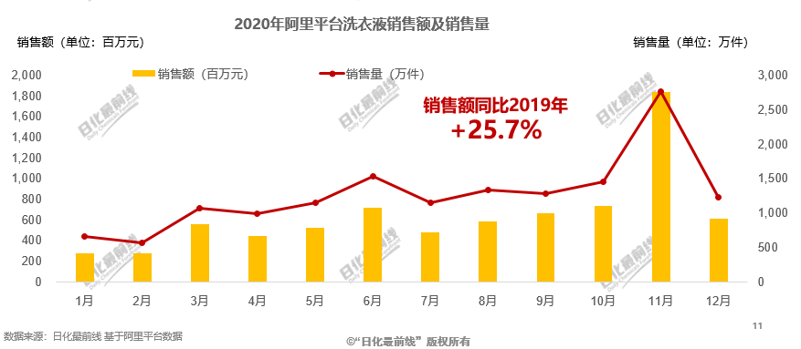 2020年阿里平臺洗衣液總體銷售額超過77億元,銷量超過15150萬件+。11月銷售額最高,達(dá)到18億元,得益于雙11的活動促銷,銷售額增長迅猛。