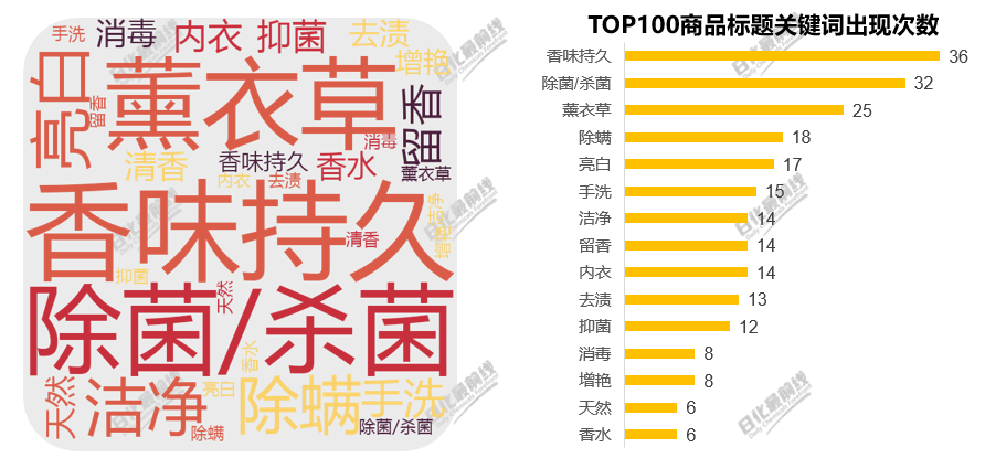 熱銷洗衣液產(chǎn)品大多強(qiáng)調(diào)其抑菌殺菌香味持久的功效,另外薰衣草香味、除螨、亮白潔凈等效果也受歡迎。