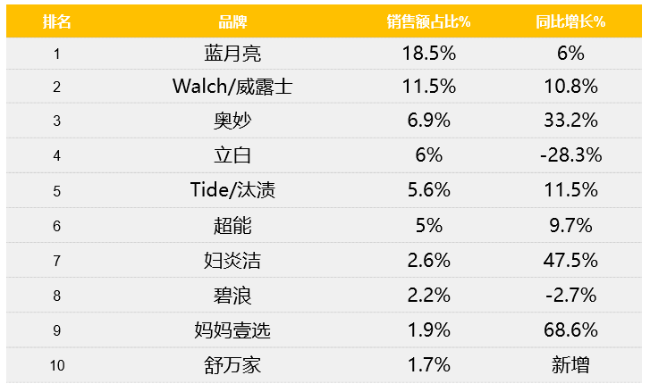 TOP10洗手液品牌同比均有不同程度的增速,其中媽媽壹選同比增速較快,達(dá)到68.6%,其次 是婦炎潔,47.5%。