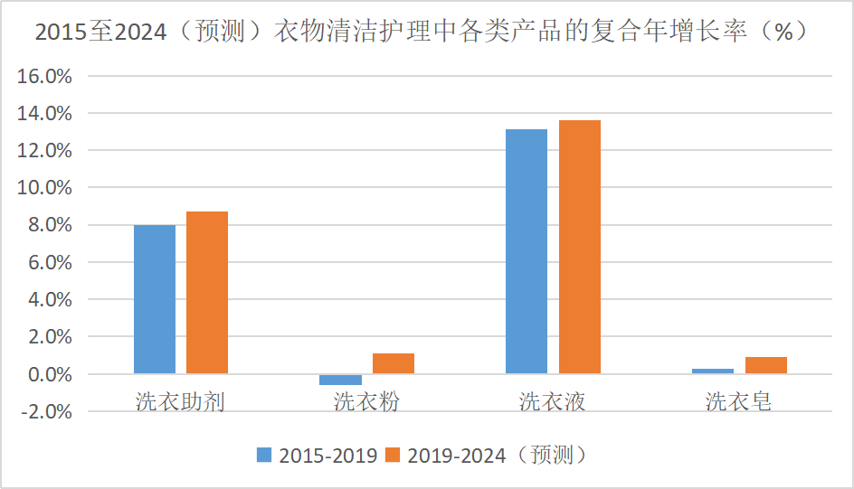 數(shù)據(jù)顯示,目前洗衣液逐漸代替洗衣粉,成為衣物清潔洗護(hù)市場(chǎng)的消費(fèi)主流。如下圖所示,2015年~2019年,在眾多的衣物清潔品類中,洗衣液以超過13%的年復(fù)合增長(zhǎng)率,持續(xù)高速增長(zhǎng);洗衣粉的年復(fù)合增速則為負(fù)值。