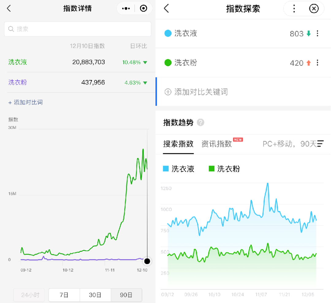 根據(jù)最近的微信指數(shù)(下圖左),洗衣液的熱度指數(shù)(90天內(nèi))以及環(huán)比增速,都遠(yuǎn)高于洗衣粉;百度指數(shù)也是同樣的趨勢(shì),洗衣液的搜索指數(shù)遠(yuǎn)高于洗衣粉。