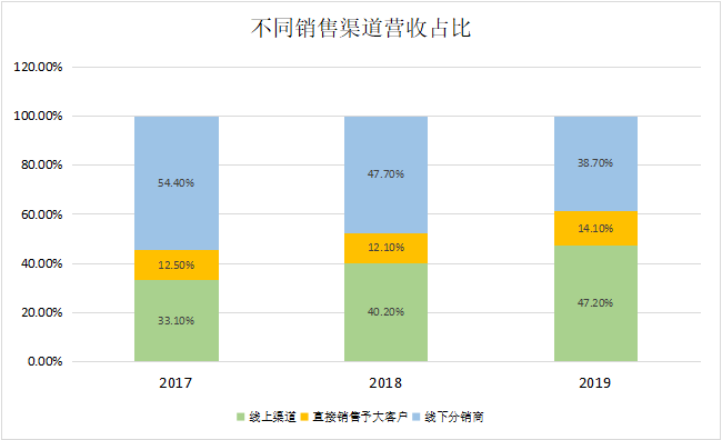根據(jù)招股書數(shù)據(jù),在渠道結(jié)構(gòu)上,藍(lán)月亮2017-2019年線上渠道貢獻(xiàn)的營(yíng)收占比逐步提升,2019年線上營(yíng)收占比總營(yíng)收的47.1%。