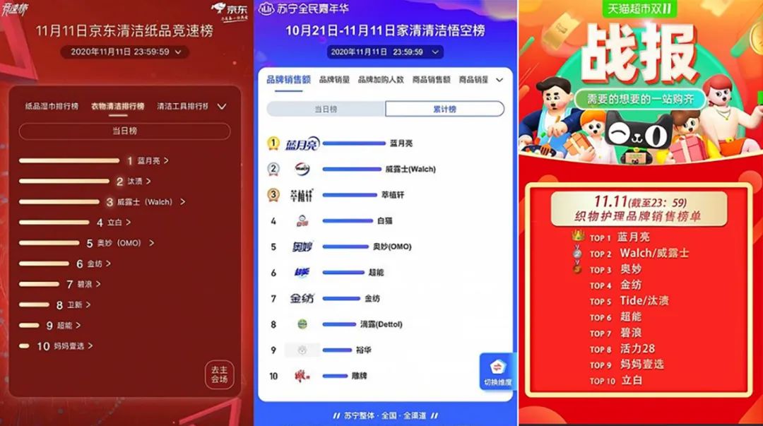 以今年雙十一為例,在京東、天貓、蘇寧三大平臺(tái)上,藍(lán)月亮的銷售額均排在第一位。