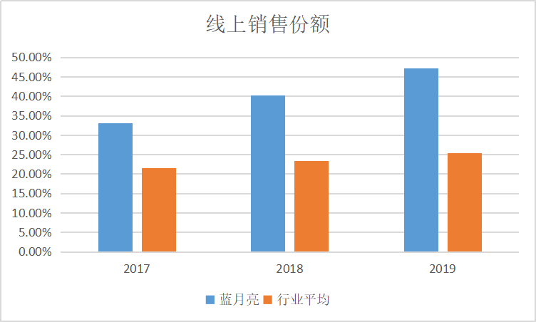 把握機(jī)會(huì),重磅布局線上的藍(lán)月亮,業(yè)績(jī)快速釋放。如下圖所示,2017-2019年藍(lán)月亮線上銷售份額高于行業(yè)平均水平。