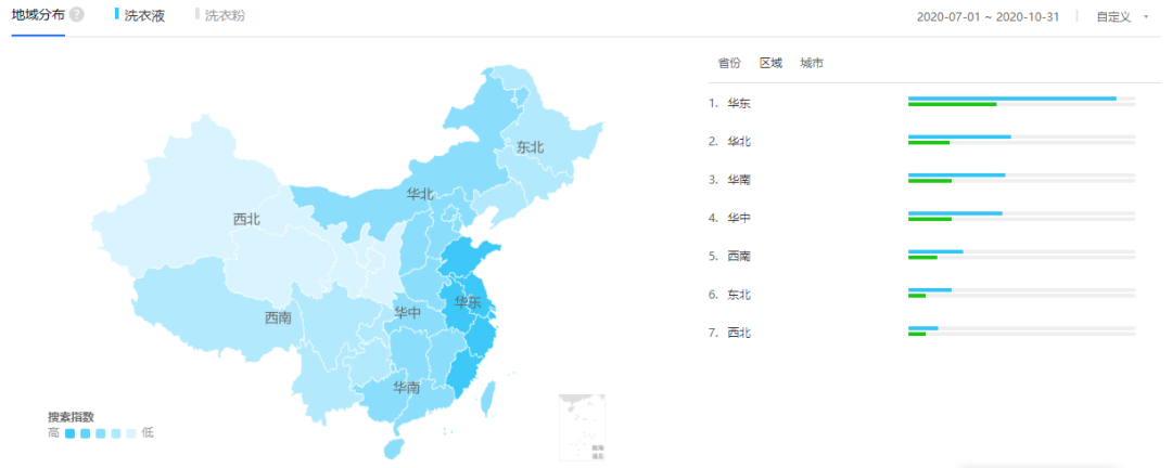 百度指數(shù)反饋顯示,隨著時(shí)間的推移,國(guó)內(nèi)洗衣液的滲透率的確呈上升趨勢(shì)。但滲透率程度在不同地區(qū),卻表現(xiàn)不同——從下圖可以看到,滲透率從東到西在依次減弱。