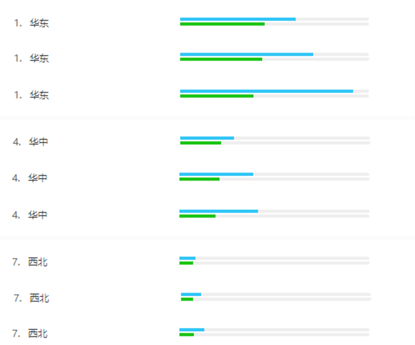 各區(qū)域的洗衣液、洗衣粉滲透率對(duì)比從上到下依次為2013.7.1-2013.10.31,2016.7.1-2016.10.31,2020.7.1-2020.10.31。