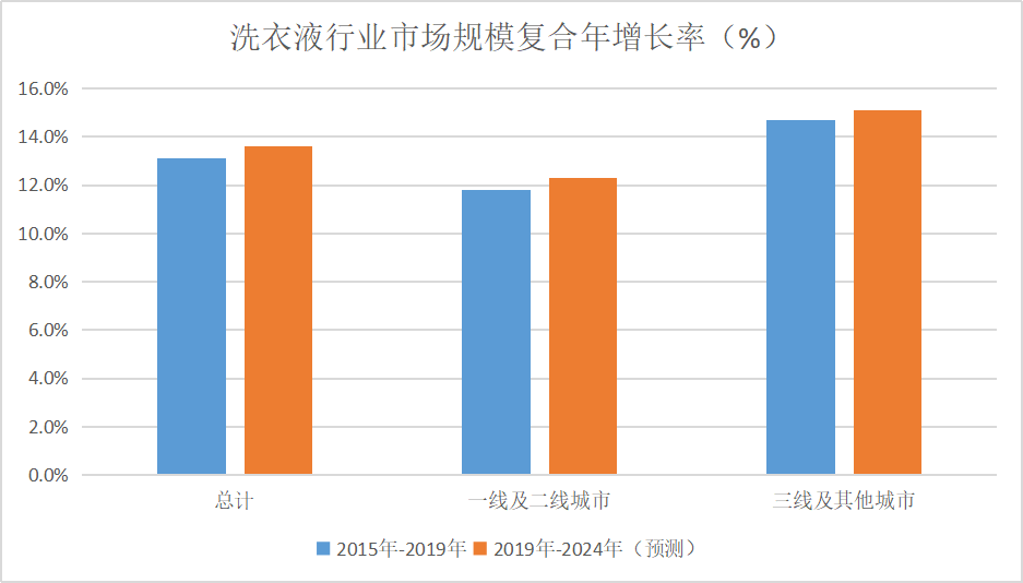 除了區(qū)域性分化,分級(jí)市場(chǎng)也表現(xiàn)出同樣的趨勢(shì)。對(duì)比2015年~2019年洗衣液在分級(jí)市場(chǎng)的年復(fù)合銷售增速,屬于下沉市場(chǎng)的三四線城市明顯高于一二線城市。