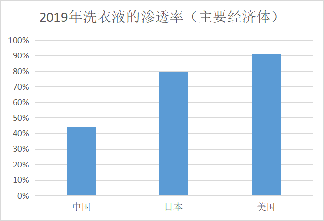在全球主要經(jīng)濟(jì)體中,2019年日本市場(chǎng)的洗衣液滲透率為79.5%,美國(guó)市場(chǎng)的洗衣液滲透率高達(dá)91.4。與之相比,國(guó)內(nèi)同期的洗衣液滲透率僅為44%。