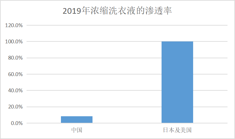 另一方面,洗衣液濃縮化已經(jīng)成為發(fā)達(dá)國(guó)家的主流消費(fèi)趨勢(shì)。根據(jù)弗若斯特沙利文的報(bào)告,美國(guó)、日本2019年的濃縮洗衣液滲透率達(dá)到了100%,與之相比,中國(guó)2019年的濃縮洗衣液滲透率僅為8.2%。