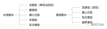 把香水香型分為女用和男用兩大類,每大類中又分為若干小類,如下所示。