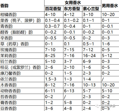 各香韻的用料比例量,可根據(jù)香型的不同進(jìn)行變化,以花香型、東方香型、素心蘭型視為基礎(chǔ),增加其他香韻的原料形成醛香(脂肪醛1%以下)型、青香(青香香料1.5%以下)型、辛香(辛香香料4%以下)型、革香(樺焦油、海貍香)型、煙香(煙葉凈油、黑香豆凈油)型等不同香型。
