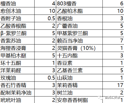 (9)木香(包括木香兼有龍涎香或壤香):檀香油(天然品)、803檀香、208檀香、檀香醚、伊斯波(ISO Esuper)、乙?;啬鞠⒓谆啬久?、柏木油、乙酸柏木酯、廣藿香油、香根油、乙酸香根酯。