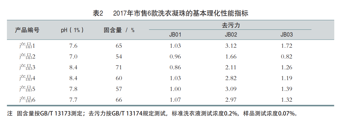 2.2 洗衣凝珠的理化性能指標2017年6款洗衣凝珠產(chǎn)品的基本理化性能指標如表2所示。從數(shù)據(jù)上看,6款洗衣凝珠的水溶液pH在7~9范圍內(nèi),堿度較低,與普通洗衣液相當;固含量處于(60±10)%左右;不同產(chǎn)品的去污力差異較大,從對JB02的去污力數(shù)據(jù)可以看出,6款洗衣凝珠都添加了蛋白酶。