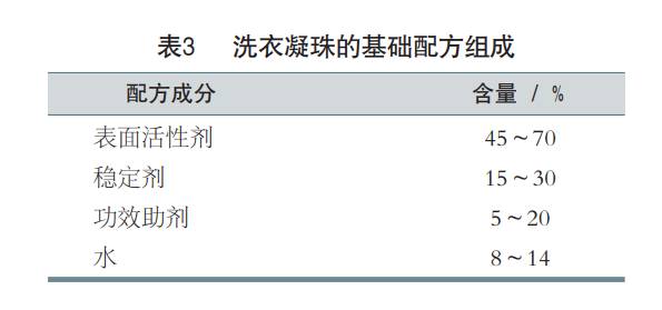 此外,在洗衣凝珠配方開發(fā)過程中,需要特別注意洗滌劑與水溶膜的相容性,除考慮外觀的變化外,還需要關(guān)注膜的溶解性變化,不合適的配方會導(dǎo)致膜的溶解性大幅度降低,影響產(chǎn)品的最終使用效果。3.2.5 洗衣凝珠的基礎(chǔ)配方組成表3給出了市場上洗衣凝珠的常見基礎(chǔ)配方組成。