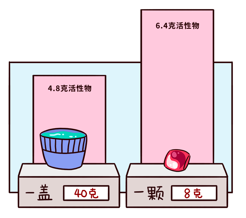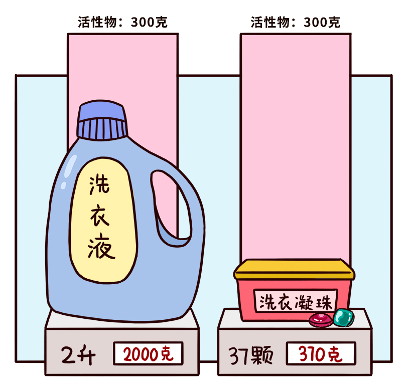 我們再來看下,在同樣含量活性物的條件下,洗衣液和凝珠的量有多少。
