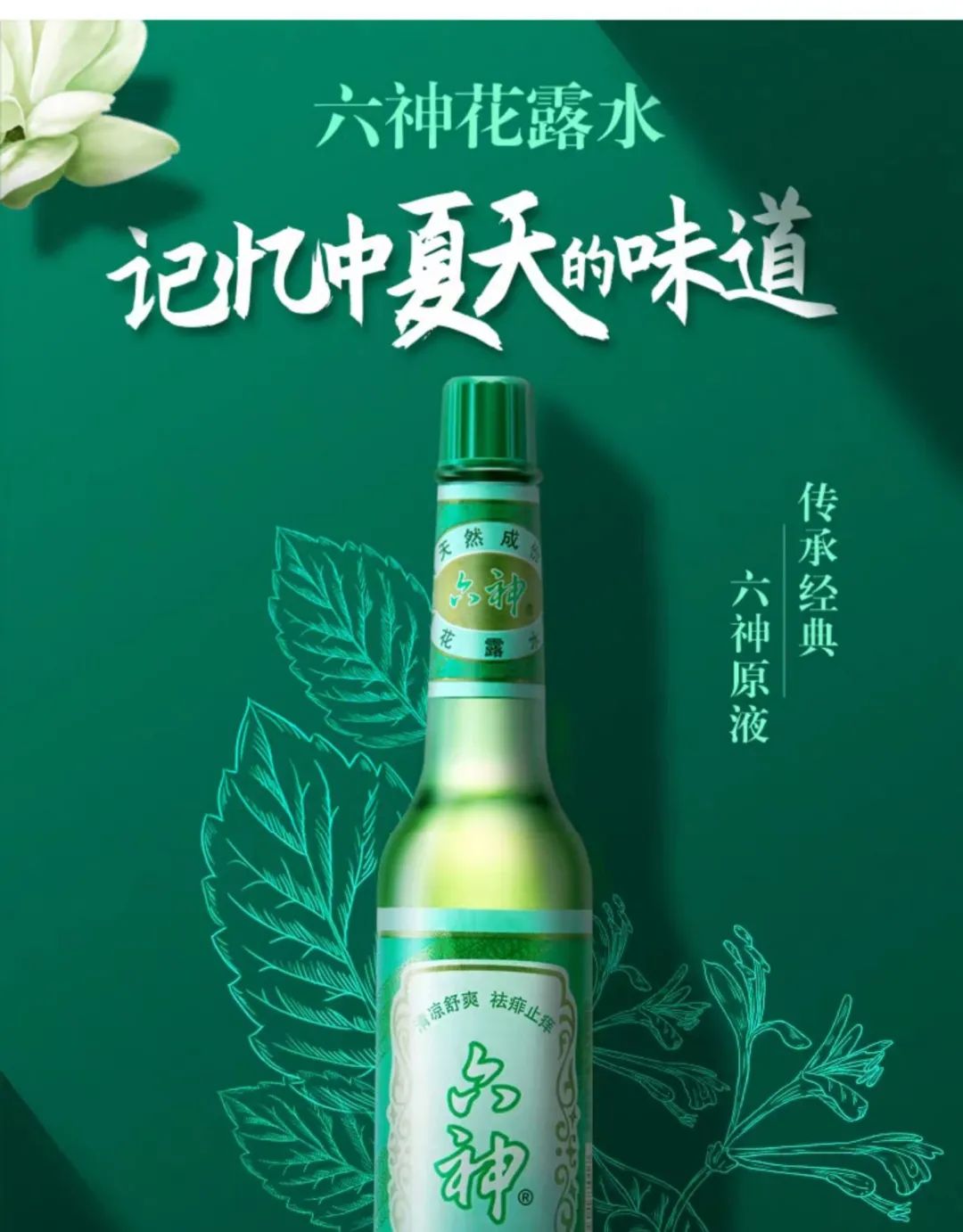 1990年,六神花露水正式誕生。它以六味中藥材(薄荷醇、冰片、金銀花、蛇膽、人工牛黃、人工麝香)為基礎,增加一些濃烈、刺激,具有遮蓋、除臭功能的香精香料。換句話說,從這個時候起,花露水終于從平民香水“淪為”日用小百貨了。