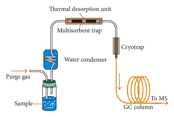 吹掃和捕集方法(動(dòng)態(tài)技術(shù))的基礎(chǔ)是用惰性氣體(通常是氦氣或氮?dú)猓┐祾邩悠罚ㄒ后w或固體);然后將揮發(fā)性化合物吸附在捕集器上,捕集器立即被加熱,將其解吸到氣相色譜儀進(jìn)樣器中。有許多吸附劑,如Porapaks、Chromosorbs或Tenax系列,都能滿足正確的熱解吸的必要要求;然而Tenax系列(基于2,6-二苯基對(duì)苯二胺的聚合物)非常適用于水醇樣品,如葡萄酒或類似的飲料。在這個(gè)意義上,已經(jīng)提出使用吹掃和捕集方法來(lái)分析水果和果汁以及酒精飲料。