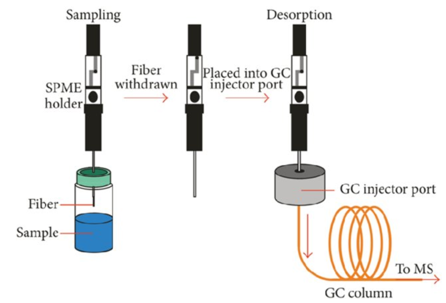 SPME是一種無(wú)溶劑的方法,集成了采樣、提取和濃縮分析物的功能。與溶劑萃取相比,SPME是一種非完全的萃取技術(shù),只有一小部分目標(biāo)分析物從樣品基質(zhì)中被萃取出來(lái)。這種技術(shù)的好處是便于攜帶,有可能實(shí)現(xiàn)自動(dòng)化,并提高靈敏度,此外,在頂空(HS)模式下使用時(shí),被動(dòng)采樣方法不會(huì)干擾樣品。