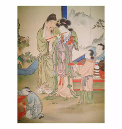 清末民國(guó)日本來(lái)淵繪《唐玄宗楊貴妃吹笛之圖》局部