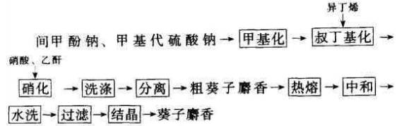 間甲苯酚與強堿反應(常用氫氧化鈉溶液)得到間甲苯酚鈉;間甲苯酚鈉再 與甲基代硫酸鈉發(fā)生甲基化反應,得到間甲氧基甲苯,加入異丁烯,發(fā)生叔丁基 化,得到產(chǎn)物 4—叔丁基—3—甲氧基甲苯,再進行乙酸酐硝化,制得粗葵子麝 香。將粗制的葵子麝香進行熱熔,用堿中和,再用去離子水洗滌,過濾,除去不 溶物(副產(chǎn)物和雜質),最后重結晶,得到葵子麝香晶體。
