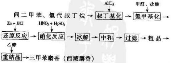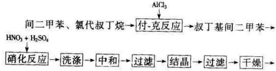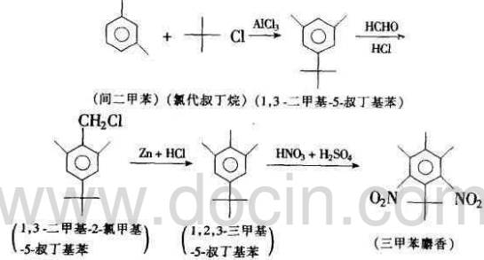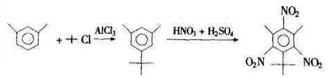 用間二甲苯和氯代叔丁烷(可由叔丁醇氯代制得)為起始原料,以三氯化鋁 為催化劑,進行付-克反應制得叔丁基間二甲苯中間體,然后在混酸下發(fā)生硝化 反應制得二甲苯麝香。反應過程如下: