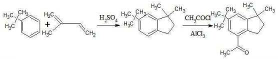 薩利麝香是屬于二環(huán)茚滿型的多環(huán)麝香,又名 4-乙?;?6-叔丁基-1,1-二甲 基茚滿,分子式為C17H24O,有讓人愉快的、強烈的麝香香氣,并有甜香香韻。 外觀為白色結晶,可溶于12 份95%的乙醇(體積質量),20 份90%乙醇(體積 質量),不溶于水,可以精油、香料相混合。其合成路線也有有很多,其中具有 工業(yè)價值以及最常用于生活生產(chǎn)當中的的,是以叔丁苯和異戊二烯為起始原料, 使用硫酸作為催化劑進行環(huán)烷化反應生成叔丁基二甲基茚滿,繼之再以氯化鋁為 催化劑與乙酰氯進行乙酰化反應而獲得之(北京日化,1983,No.1,21;美國專 利3078319)。其合成路線如下: