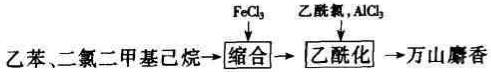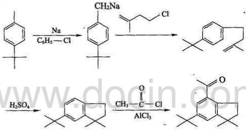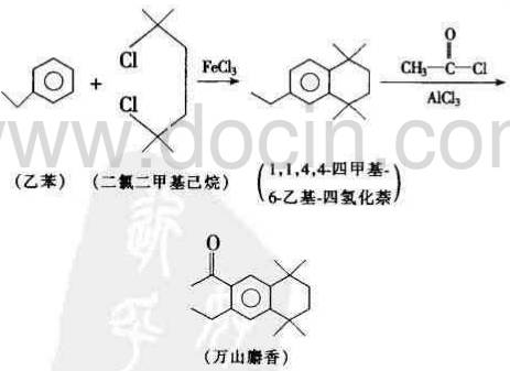 以乙苯和2,5-二氯-2,5-二甲基己烷為原料,三氯化鐵為催化劑,經(jīng)反應制得 1,1,4,4-四甲基-6-乙基-四氫化萘,然后再在三氯化鋁催化劑作用下發(fā)生酰化反應 制得萬山麝香。反應過程:
