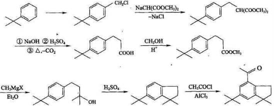 合成香料有兩大基本原理:化學合成與化工精制。下面我們將大致說一下各 種常見或人們比較熟悉的麝香香料在有機合成中的工藝流程。