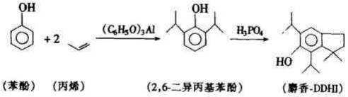 其合成是以苯酚和丙烯為原料,在苯酚鋁的催化下,經(jīng)反應生成2,6-二異丙 基苯酚,然后以磷酸為催化劑與異戊二烯反應并環(huán)而制得,其反應過程如下: